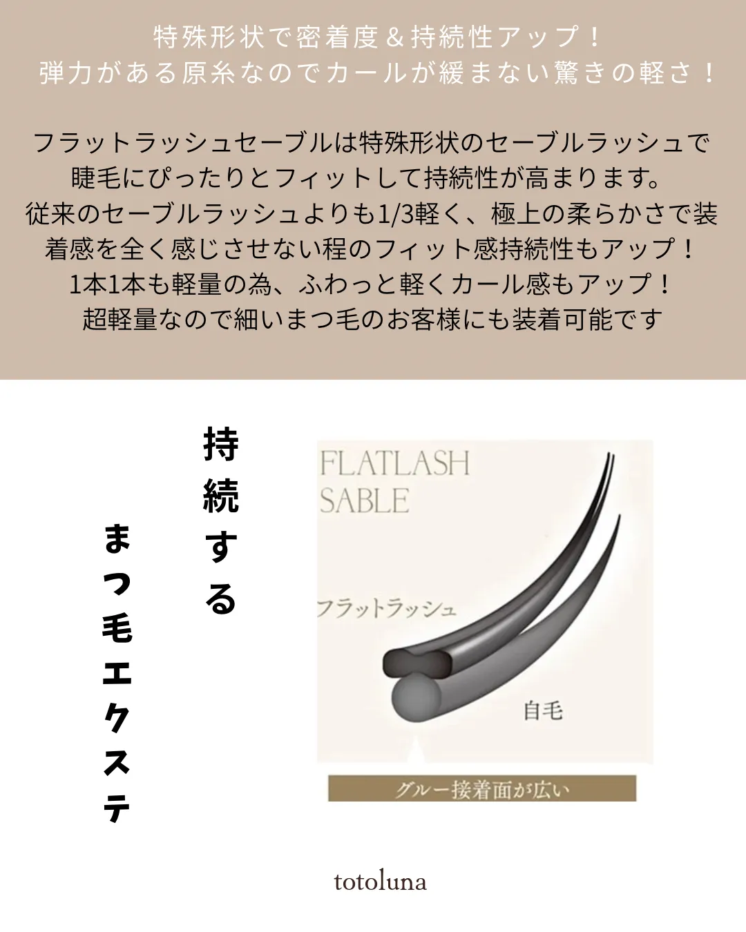 ナチュラルな美しさを引き出すエクステ選びのコツは、自まつ毛のような細さや柔らかさ、カール感を意識することにあります。特に「フラットラッシュ」や「セーブル」など軽量で柔らかな素材は、自然な仕上がりと持続力の両立がしやすいとされています。
